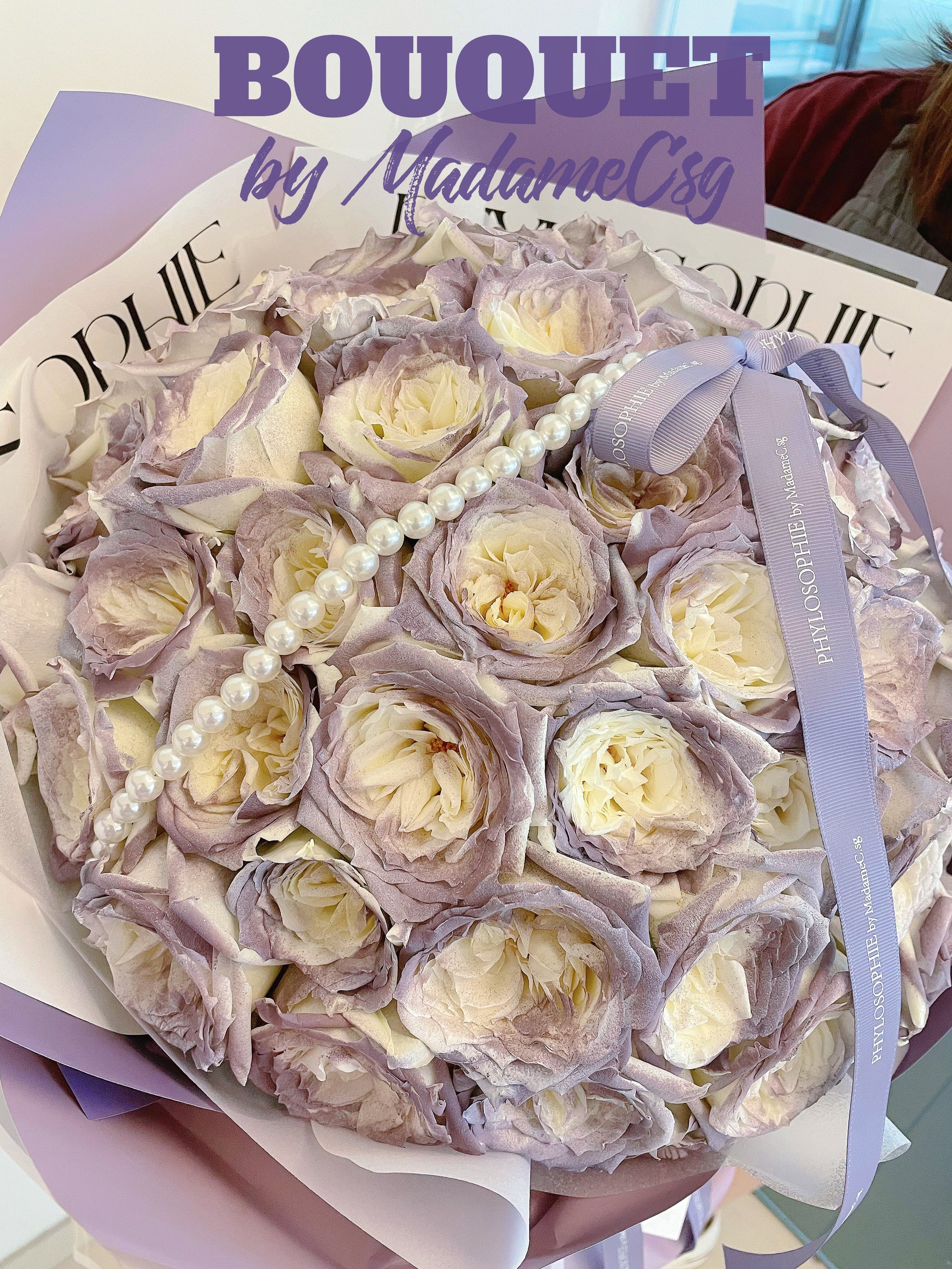 This beautiful arrangement consists of white roses 52 stk with Capri Grey Purple painting.